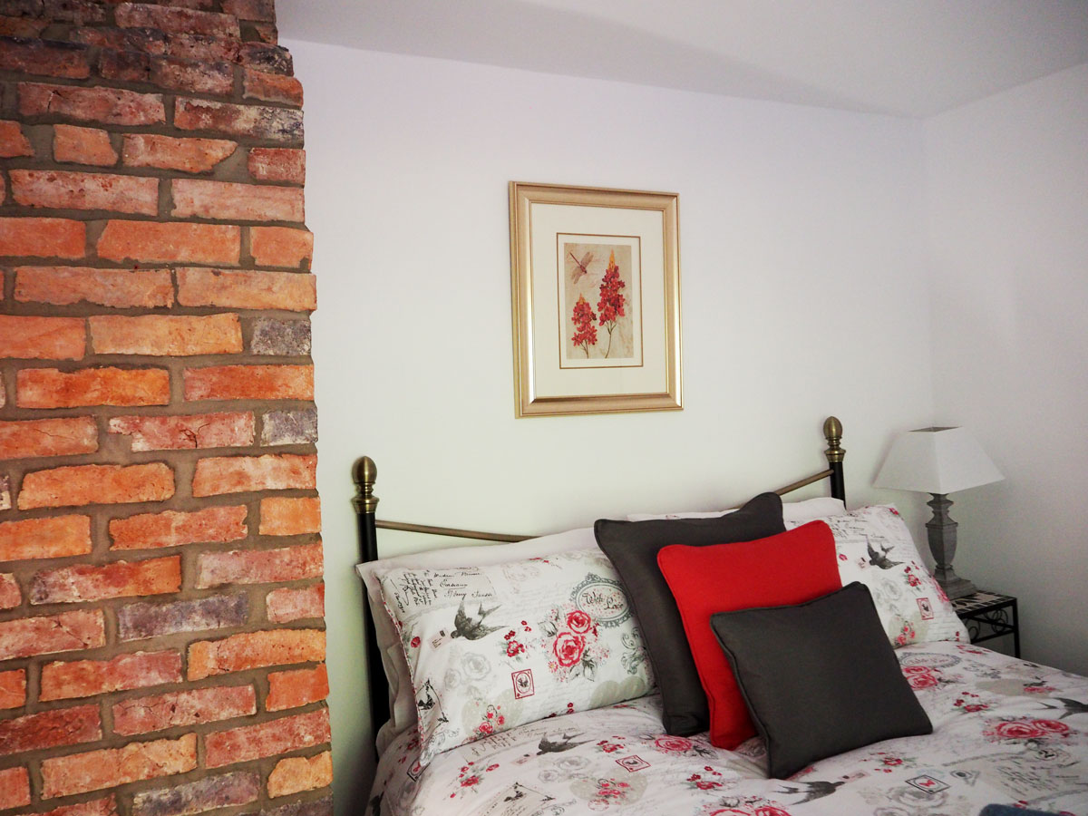 The master bedroom is fully carpeted, has a king-size bed, with a non-feather duvet, pillows, bedspread and all bedding provided. There is a remote control TV and hairdryer. Bedside tables with lamps, a wardrobe and chest of drawers for storage are all in situ.