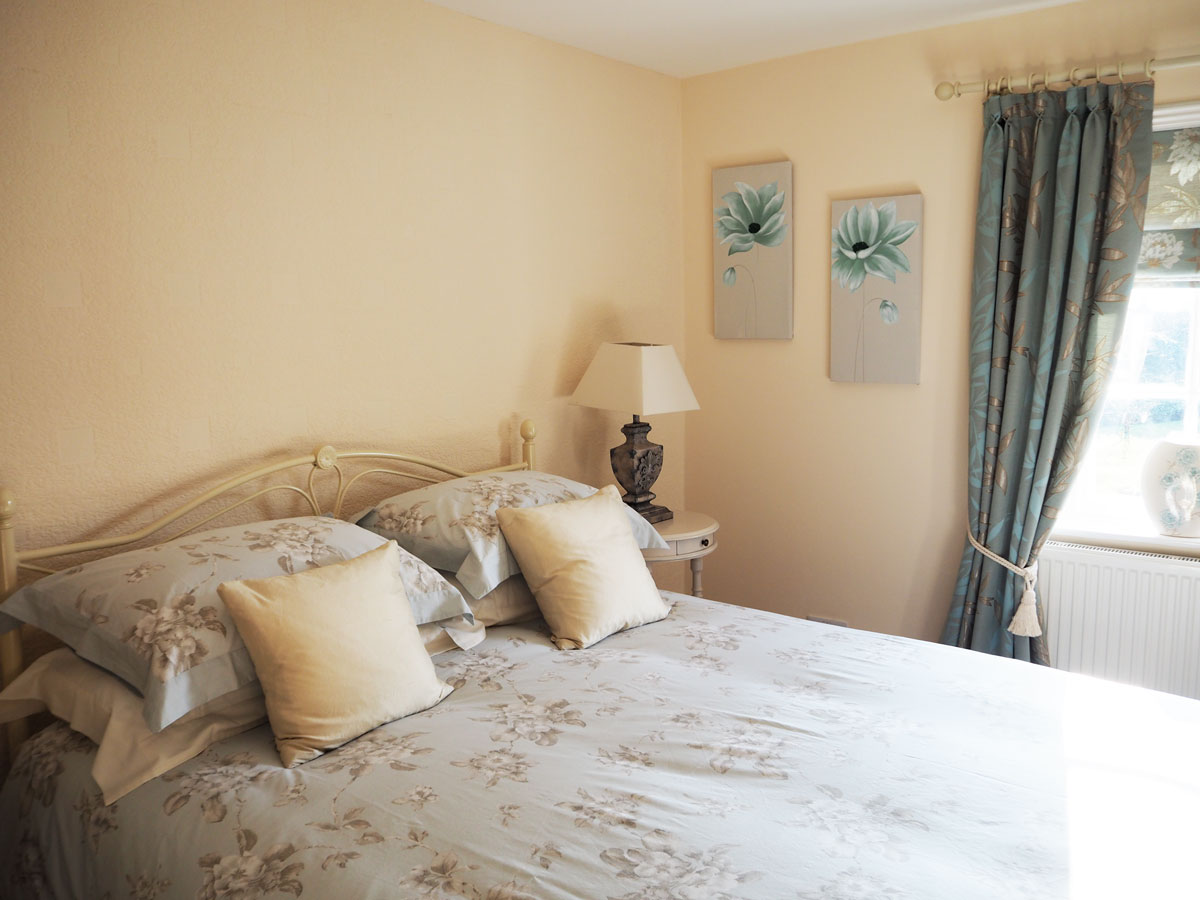 Bedroom three is fully carpeted with a double divan bed, a non-feather duvet, pillows, bedspread and all bedding provided. There is a remote control TV and hairdryer, one bedside table with lamp and a small wardrobe with shelves at the base.