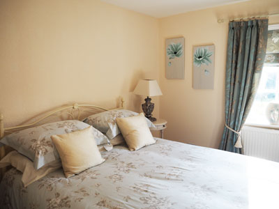 Bedroom two is also carpeted with a king- size bed, non-feather duvet, pillows, bedspread and all bedding provided. Bedside tables with lamps, a chest of drawers and an ornate hanging rail give storage space. There is a remote TV and hairdryer.
